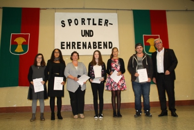 Bürgermeister Markus Rupp (rechts im Bild) ehrte Mia Fuchs (von links) für Ihren Erfolg bei den Deutschen Meisterschaften 2016, Tamara Al-Hazzaa , Dagmar Veit, Alexandra Horn, Emely Stober und Nicolas Veit, für die sportlichen Erfolge 2016.